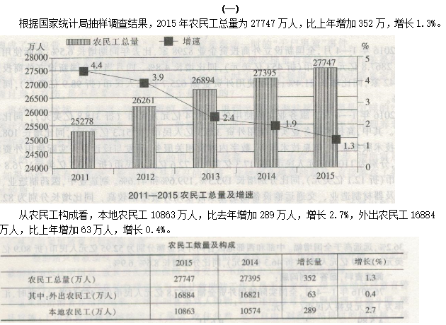 75.【答案】D。解析:A项,26261-25278=983万人,错误;B项,査找表格,外出农民工增长0.4%,错误;C项,由文字最后一段,中部地区农民工比上年增加163万人,错误;直接选D。