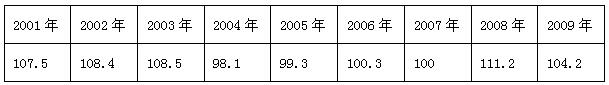 【新文泰解析】此表是国内生产总值指数表,所以要判断本期值比上期值是增大了还是减少了,只需要比较本期指数和100的关系即可。只要指数是大于100的,就表示本期值比上期值是增大的。本题中2001年、2002年、2003年、2006年、2008年、2009年的指数都是大于100的,一共有6年本期值都比上期值大,故本题选C。