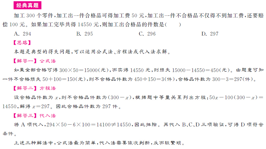 解法一套用得失问题的经典公式,直接得出答案,简单快捷。