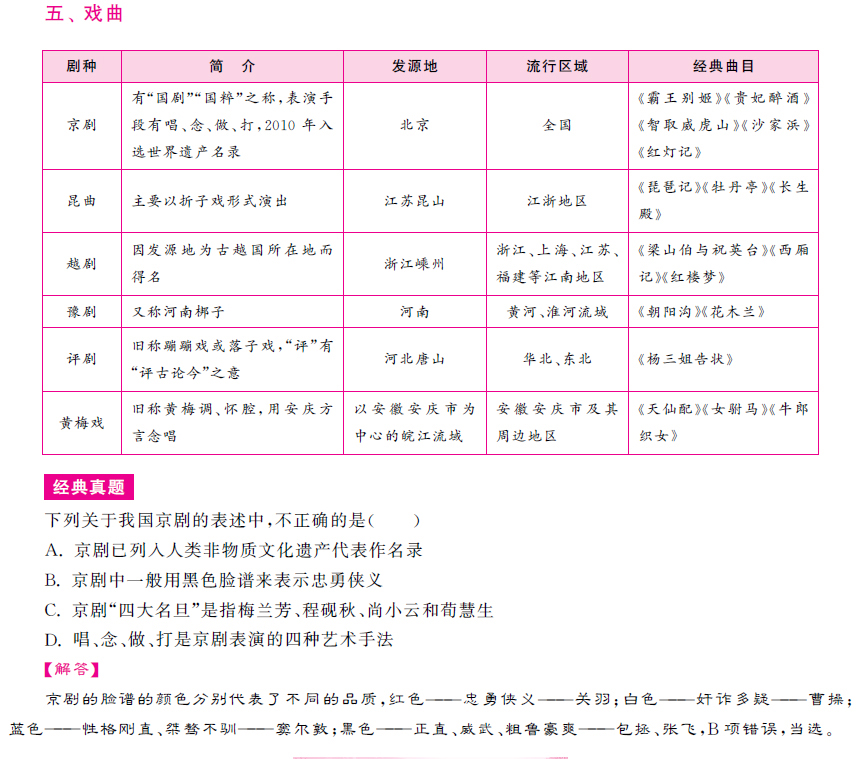 上述七道真题考的都是京剧,考点有很大的重复,甚至同一考点在不同年份、不同地区被多次考查。这不仅仅是个例,这样的示例几乎每年都有,省考会出现国考考过的,国考也会出现省考考过的。