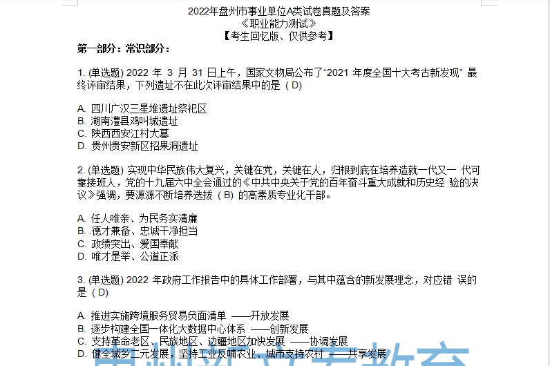 2022年盘州市事业单位A类试卷真题及答案
