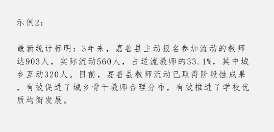 我们通过跳读法阅读过后,可以发现:嘉善县教师流动已取得阶段性成果,有效促进了城乡骨干教师合理分布,有效推进了学校优质均衡发展。 显然,这句话就是我们这个示例结论性的语言了。
