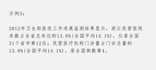 所以,我们通着比较分析这两组数据之间的关系得出:浙江民营医疗机构在本省乃至全国范围内占比明显偏小(低),那这句话就是我们的结论性的语言了。