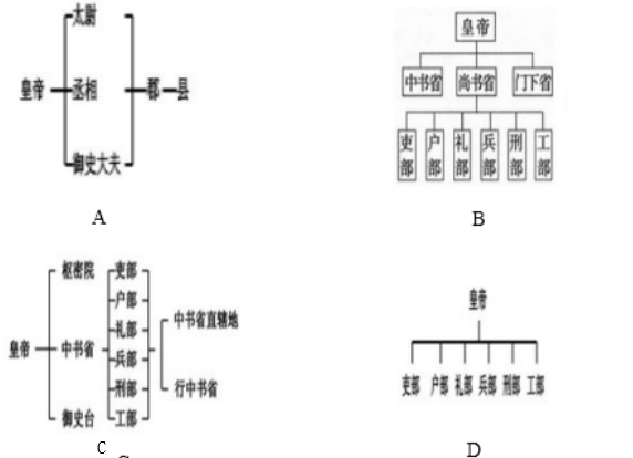 2.下面图示反映了中国古代不同时期中央机构设置的情况,其中反映明朝机构设置的图示是( )。