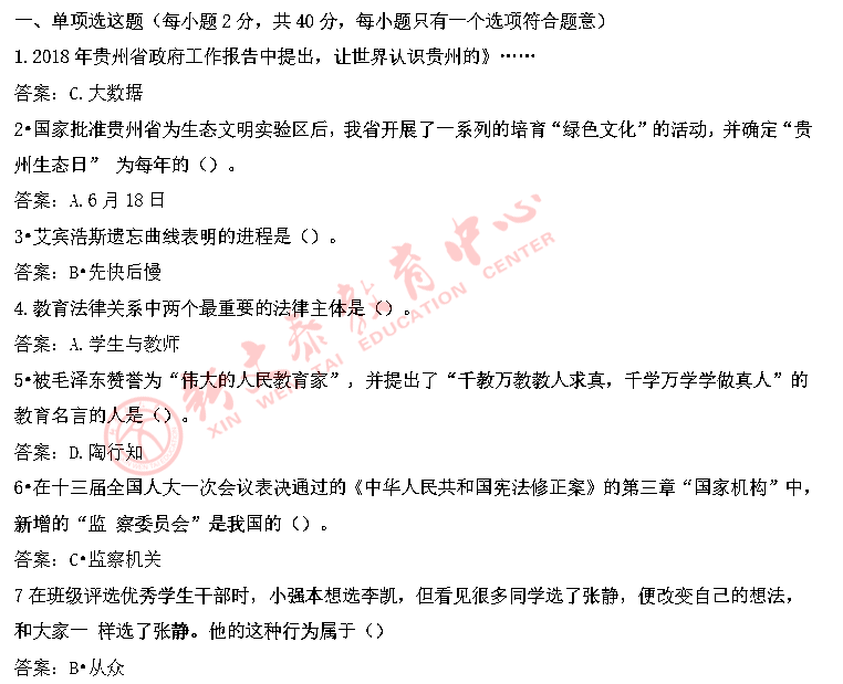 2017年贵阳市教师招考【教育综合知识】笔试真题及答案【点击查看】