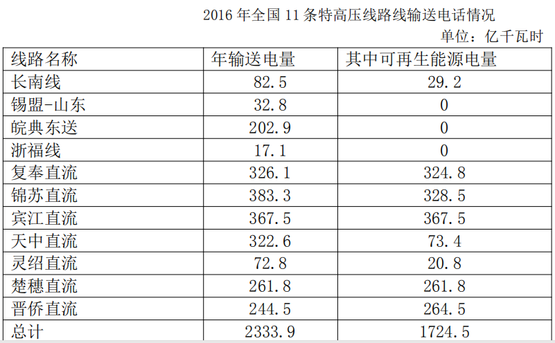 89、11 条特高压线路中,2016 年可再生能源占输送电量比重为 100%的线路年输