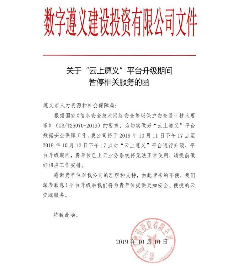 接数字遵义投资建设有限公司通知,因“云上遵义”平台升级维护,2019年10月11日17点至10月12日17点我局“遵义人社”微信公众号的成绩查询功能可能会受影响,待升级维护结束后成绩查询功能将恢复正常。