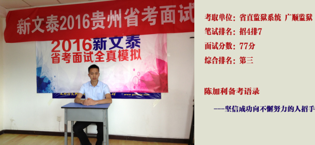 公务员笔试后,不知是否进入面试,为了保险起见,不放过任何机会,我也积极的投入到备战中。在新文泰培训了一个周,后面就是自习,最后在黔南州事业单位统考中,考的家乡的人社部门笔试第一。