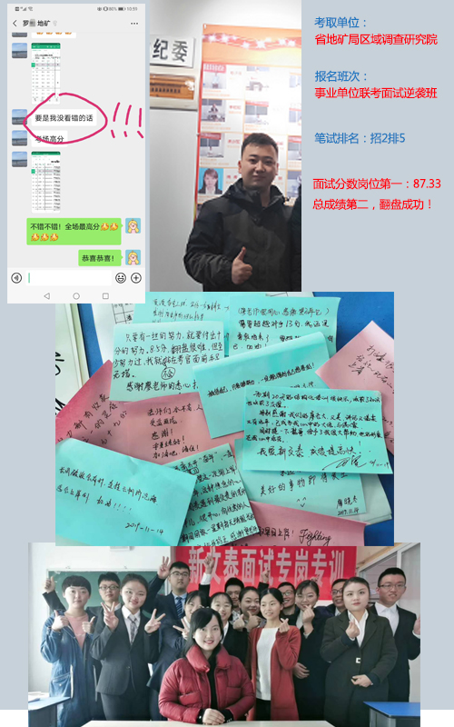 新文泰不像其他的某些机构一样采取大班教学的人海战术,对某些机构来说,他的学员数量众多,你考不上,但总有人能考,一次培训下来,甚至于老师连你叫什么名字都还不清楚。而新文泰则不一样,他走的是求质量的教育的模式。老师会争对每一位学员的特点进行辅导,最重要的是,老师们不会放弃每一位学员,不会因为你是最后一名上岸几率小而放弃你,不会因为你的天赋差而放弃你,而这一点也是我最喜欢的地方,因为只有你发现你还被给予希望,没有被放弃的时候,你才有翻盘的机会。自信真的很重要。
