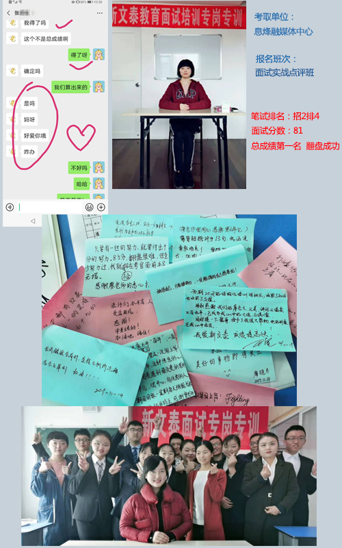 知道笔试成绩时第一时间联系了新文泰的老师分析看看能不能入围,莫名的信任他们,我性格是那种比较担心的性格所以一直都很担心,排名出来之后第五(第三名同分),然后老师说分差不多啊有希望,然后马上就投入培训,当时咨询老师就给我推荐廖美人老师,然后就感觉廖老师很厉害我肯定有希望的,哪知道上课后我发现自己好弱,别人都好会说好有点,我乱七八糟什么都说不好,然后就找廖老师聊(发牢骚)廖老师一直鼓励我要有信心,平时我有疑问老师都能解答真的特别贴心,真是贴心小棉袄呀!临到考试老师都一直一直在鼓励我们,考完试我也第一时间联系了老师,她也很肯定的告诉我问题不大,她真的是我最坚实的后盾,今天她突然恭喜我,正在上班的我不能淡定,一直在骚扰她问她“确定吗”,最后真的是我逆袭成功了!我终于可以上光荣榜了!?