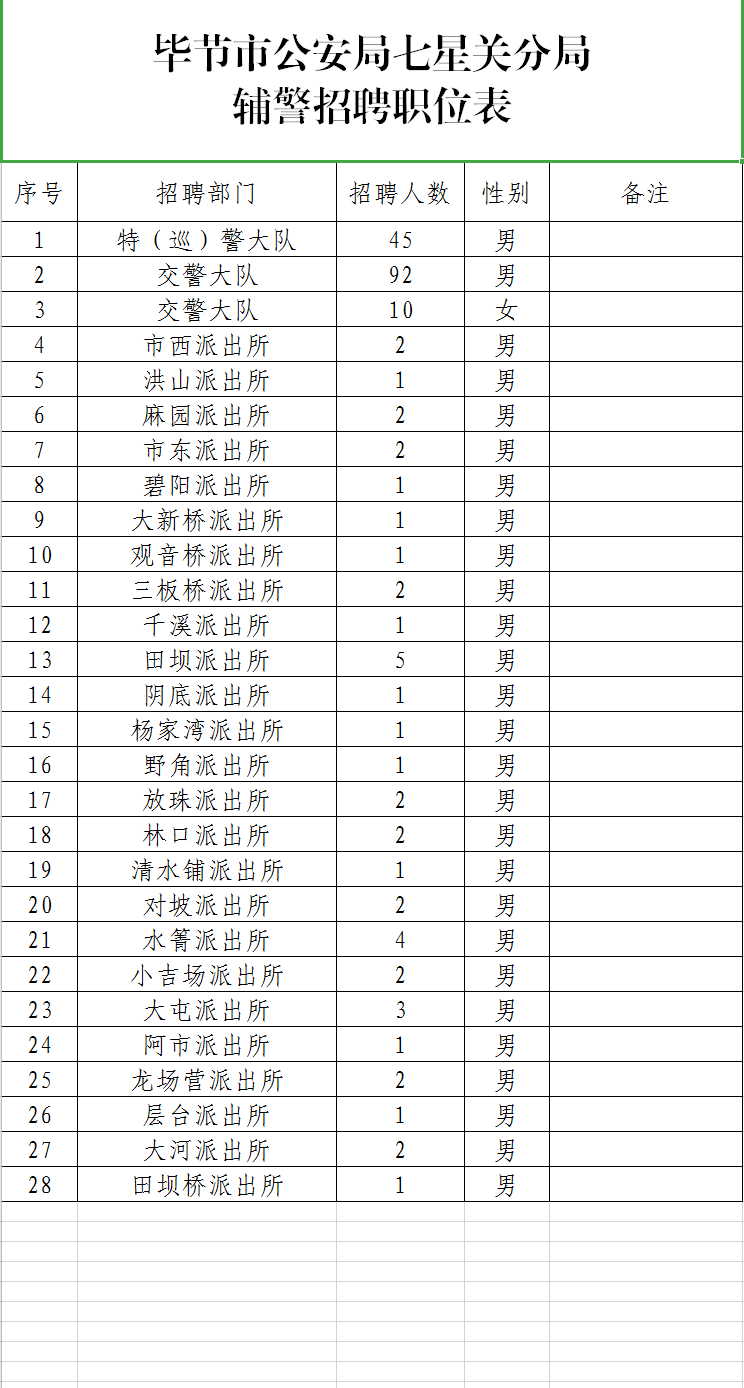 为有效维护毕节市七星关区社会治安环境,不断提升人民群众安全感满意度。按照公开、平等、竞争、择优的原则,毕节市公安局七星关分局特面向社会公开招聘警务辅助人员,为确保招聘工作顺利完成,现将有关事宜公告如下。