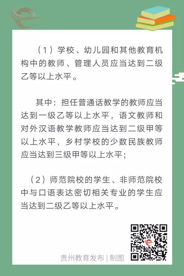 近日,贵州省教育厅印发通知决定:从2020年4月10日起,废止2013年7月26日制定下发的《省教育厅 省语言文字工作委员会关于全省教育系统普通话水平等级有关要求的通知》(黔教语发〔2013〕324号)。全省教育系统普通话水平等级要求按国家标准执行。