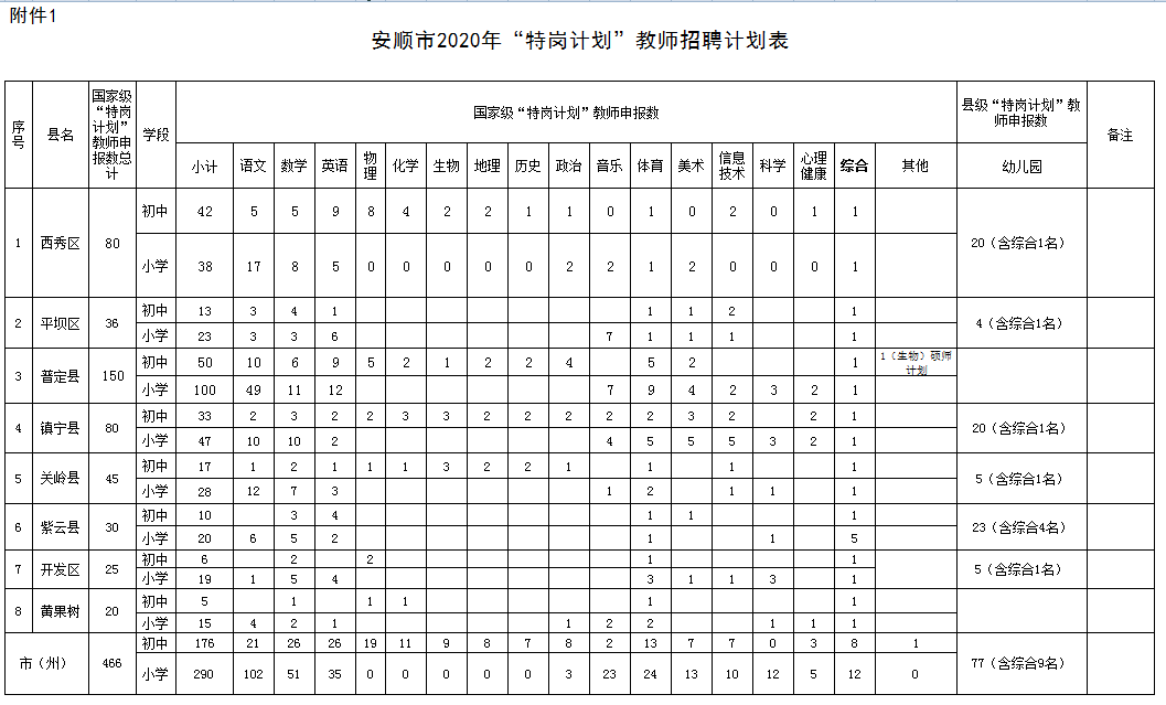 附表:1.安顺市2020年“特岗计划”教师招聘计划表