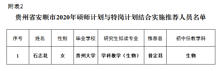 为做好我市2020年农村义务教育阶段学校教师特设岗位计划(以下简称“特岗计划”)实施工作,吸引优秀高校毕业生投身我市乡村教育事业,根据《教育部财政部人事部中央编办关于实施农村义务教育阶段学校教师特设岗位计划的通知》(教师〔2006〕2号)、《教育部办公厅财政部办公厅关于做好2020年农村义务教育阶段学校教师特设岗位计划实施工作的通知》(教师厅〔2020〕2号)、《省教育厅 省委编办 省财政厅 省人力资源和社会保障厅关于印发<贵州省2020年农村义务教育阶段学校教师特设岗位计划实施方案>的通知》(黔教发〔2020〕36号)、《人力资源社会保障部 教育部 司法部 农业农村部 文化和旅游部 国家卫生健康委国家知识产权局关于应对新冠肺炎疫情影响实施部分职业资格“先上岗、再考证”阶段性措施的通知》(人社部发〔2020〕24号)、《人社部等7部门有关司局负责同志就实施部分职业资格“先上岗、再考证”阶段性措施答记者问》和省教育厅教师工作处《关于调整上报“特岗计划”岗位学科设置有关事宜的通知》的工作安排,现将安顺市2020年“特岗计划”教师招聘有关事项公告如下: