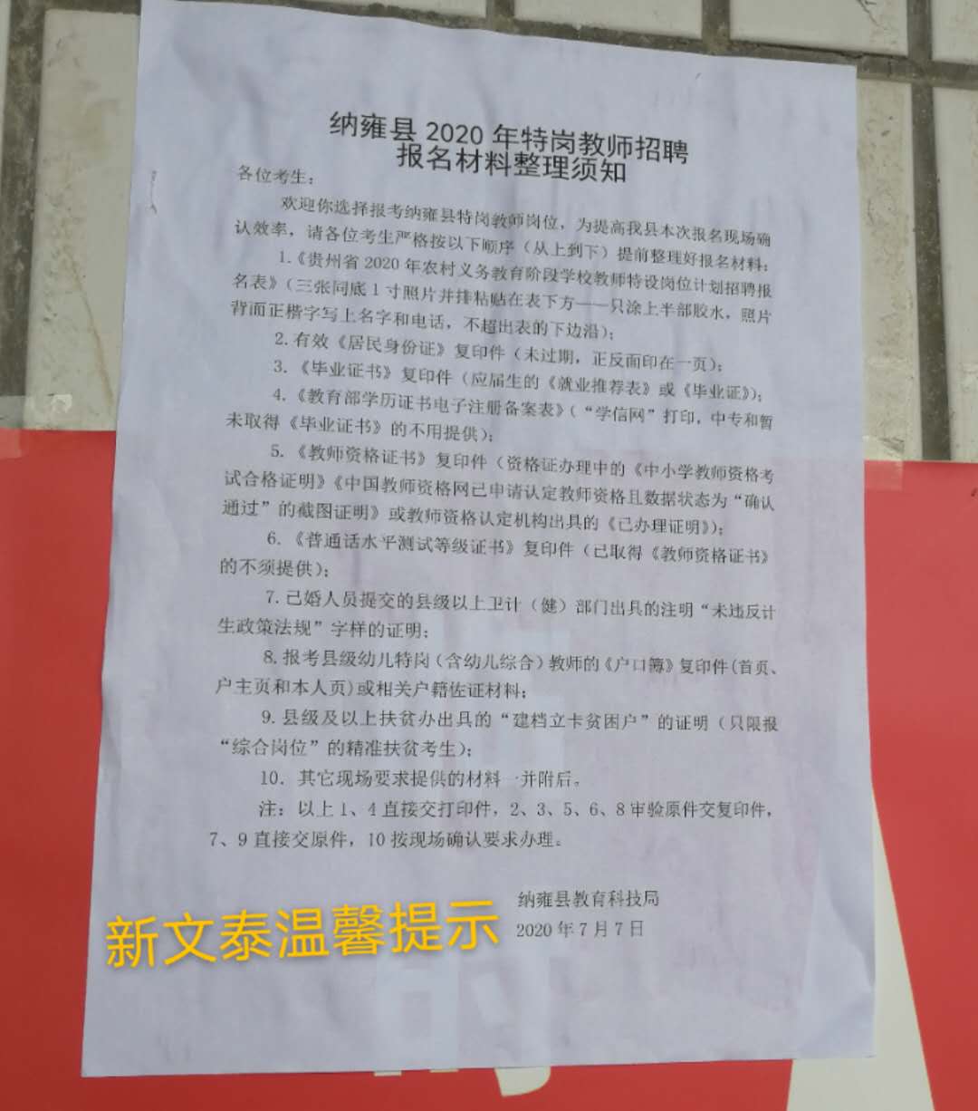 2020年纳雍县特岗教师现场审核材料整理须知