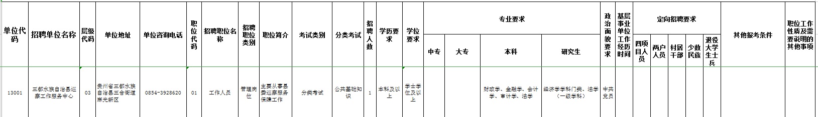 《三都水族自治县2020年统一面向社会公开招聘事业单位工作人员职位一览表》中,单位代码13001,三都水族自治县巡察工作服务中心01工作人员职位,其他报考条件由“限应届高校毕业生”改为“不限”,更正后专业要求具体如下。