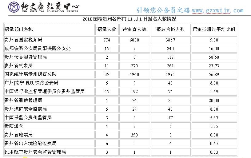 2018年国家公务员考试报名时间为10月30日9点至11月8日18点,据贵州新文泰教育统计,11月1日贵州地区职位报名人数达到11850人,通过审核总人数为4738人,平均竞争比例5.19:1。考生需注意这并不是最终的报名人数,审核时间是截至2018年11月10日16:00。