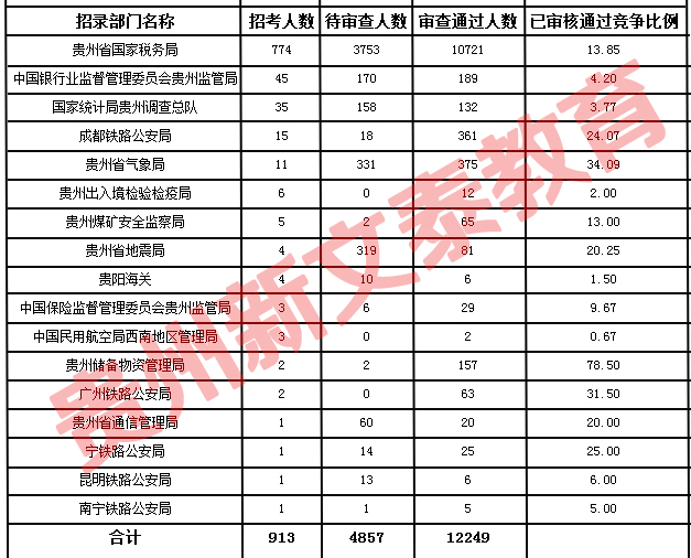2018年国家公务员考试报名时间为10月30日9点至11月8日18点,据贵州新文泰教育统计,截至11月2日16时国考职位中贵州地区职位报名人数达到17106人,通过审核总人数为12249人,平均竞争比例5.31:1。考生需注意这并不是最终的报名人数,审核时间是截至2018年11月10日16:00。贵州新文泰教育将整理统计具体职位报名情况,请考生及时关注新文泰教育官网!