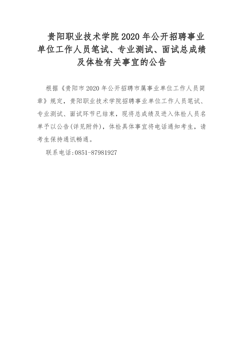 关键字:贵阳职业技术学院,2020年,招聘事业单位工作人员,笔试、专业测试、面试总成绩及体检有关事宜的公告