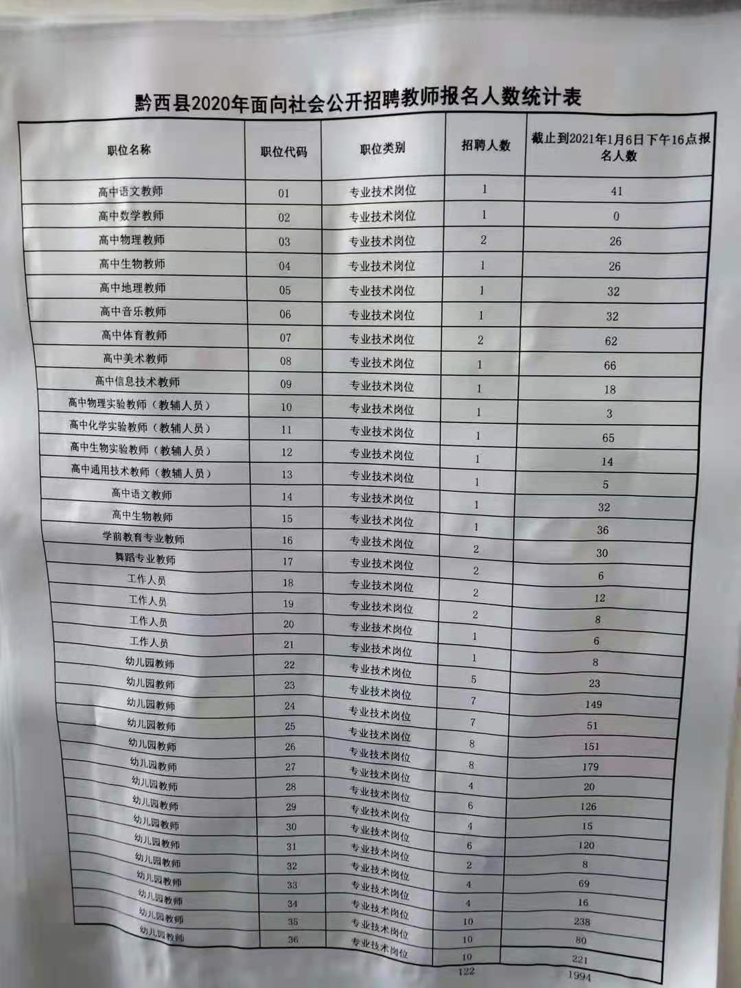 2020年黔西县招聘教师1月6日报名人数统计表(已报1994人,截止到16:00)