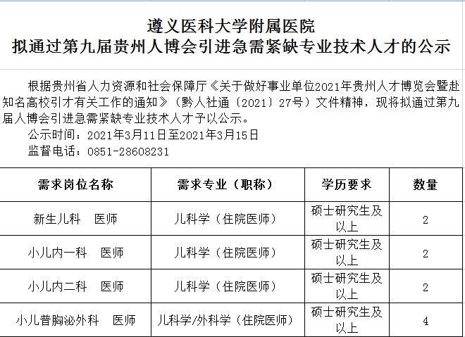 遵义医科大学附属医院拟通过第九届贵州人博会引进急需紧缺专业技术人才的公示