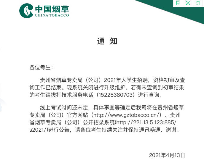 贵州省烟草专卖局(公司)2021年大学生招聘未查询到初审结束的通知