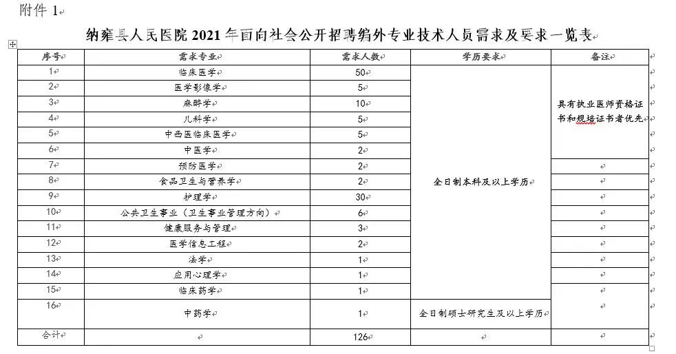 根据工作需要,公开招聘编外专业技术人员126名,招聘条件详见《纳雍县人民医院2021年面向社会公开招聘编外专业技术人员岗位及要求一览表》(附件1),凡符合本次公开招聘要求的人员,均可报名。
