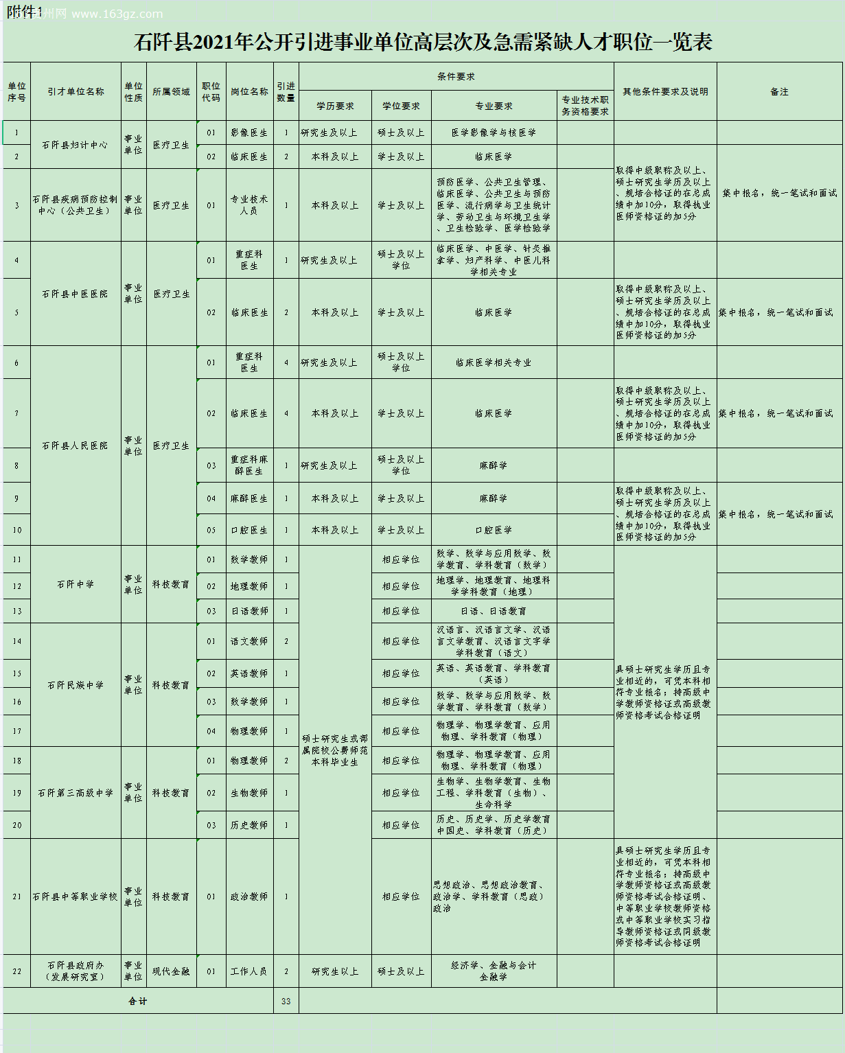 本次计划公开引进事业单位高层次及急需紧缺人才33名,其中:综合类2名,教育类13名,卫生类18名。具体职位详见《石阡县2021年公开引进事业单位高层次及急需紧缺人才职位一览表》(附件1)。
