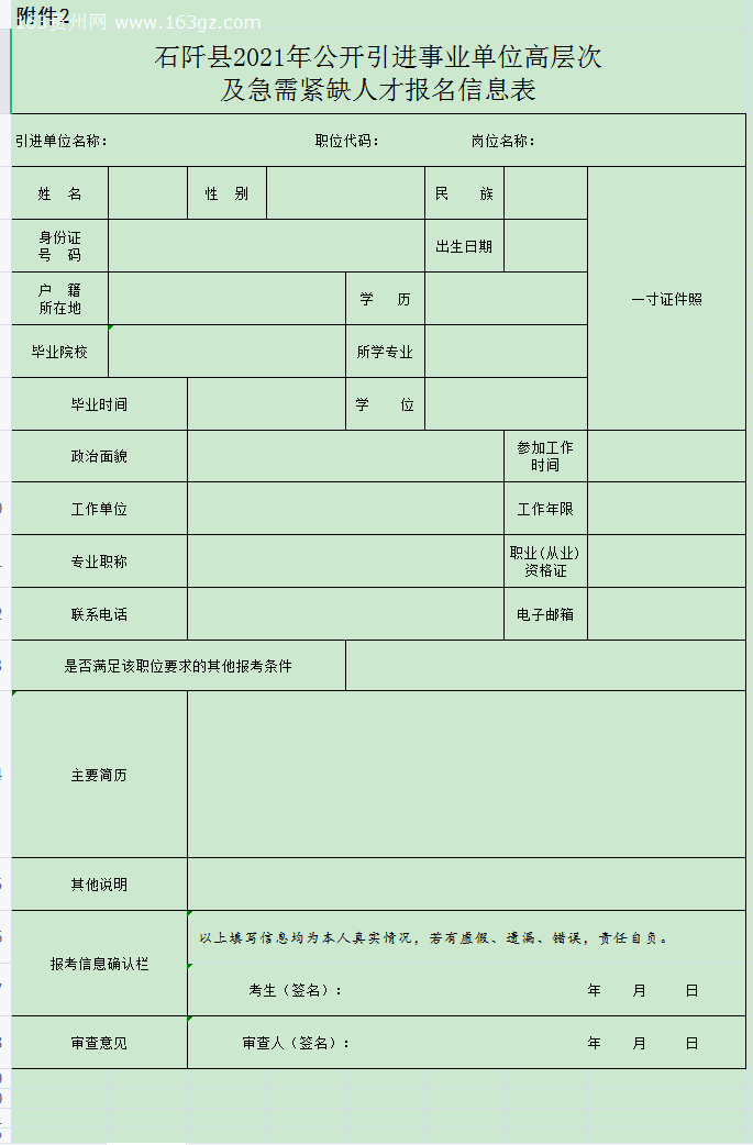 报名时如实填写《石阡县2021年公开引进事业单位高层次及急需紧缺人才报名信息表》(附件2),每人只能填报一个岗位,并提供近期同底1寸免冠证件照3张。