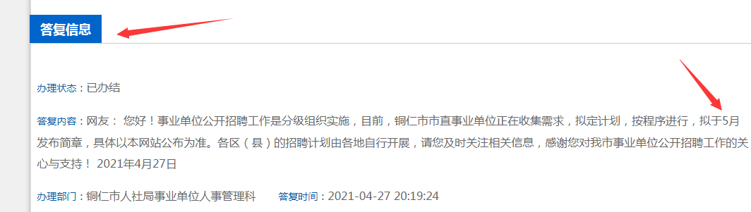 从图片内容可知,铜仁市人社局事业单位人事管理科在4月27日答复网友信息,铜仁市市直事业单位正在收集招考需求,拟于5月分发布招考简章。