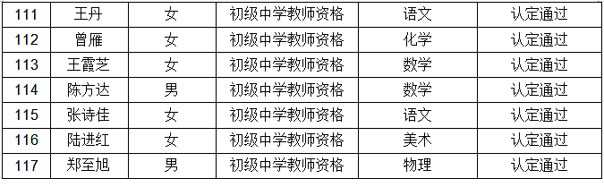 根据教育部教师资格认定指导中心《关于做好2021年教师资格制度实施工作的通知》(教资字〔2021〕2号)文件通知以及省、市教师资格证认定工作相关文件精神和《观山湖区2021年上半年第一批次中小学教师资格认定公告》,经网上报名、体检、现场确认等环节,观山湖区2021年上半年第一批次中小学教师资格证认定工作已完成。钟莉等117名人员符合所申请的相应教师资格条件,现将认定通过人员名单进行公示(见附件)。