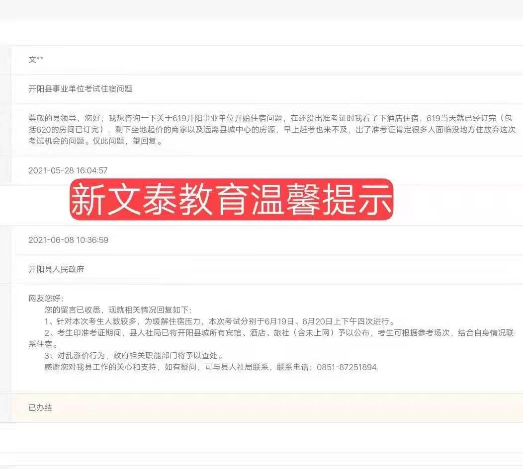 考生印准考证期间,县人社局已将开阳县城所有宾馆、酒店、旅社(含未上网)予以公布,考生可根据参考场次,结合自身情况联系住宿。