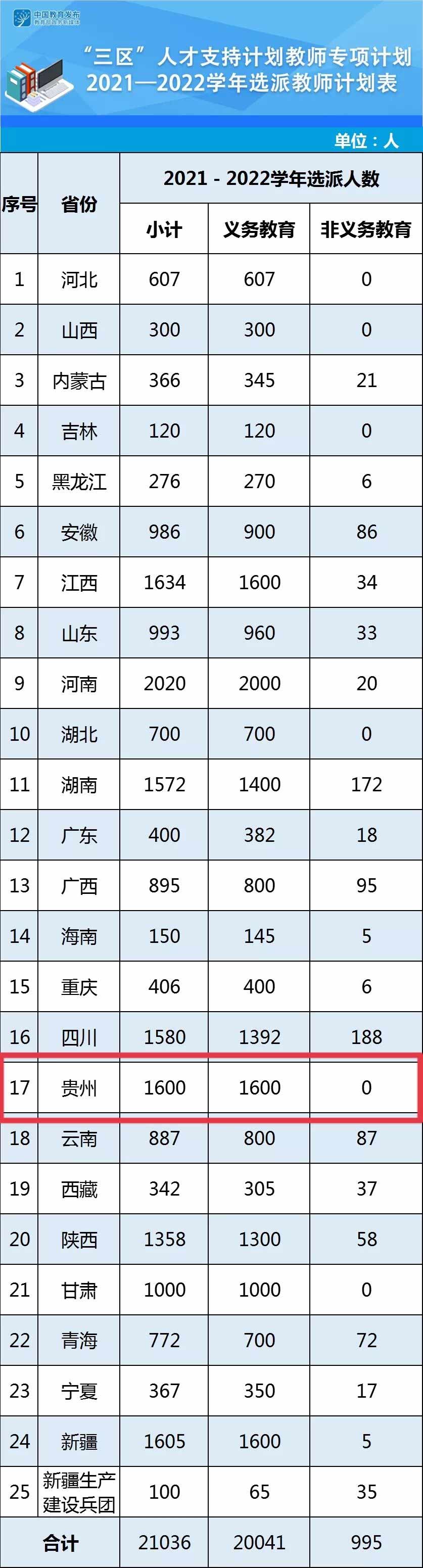 日前,教育部、财政部发布《关于做好2021年“三区”人才支持计划教师专项计划有关实施工作的通知》。2021—2022学年全国计划选派21036名教师,其中贵州有1600名。