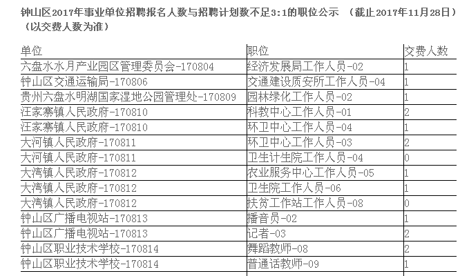 钟山区2017年事业单位招聘报名人数与招聘计划数不足3:1的职位公示 (截止2017年11月28日)(以交费人数为准)
