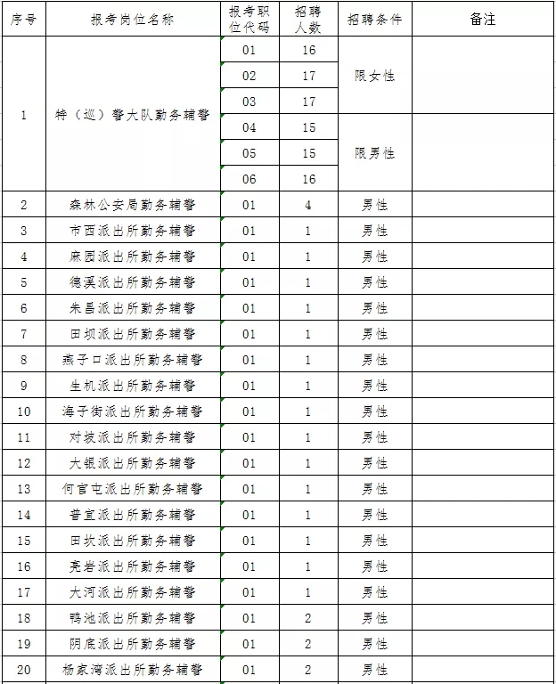 本次招聘公安机关警务辅助人员岗位为勤务辅警,共162名,其中男性辅警112名,女性辅警50名。招录职位详见《毕节市公安局七星关分局面向社会公开招聘辅警职位表》(附件1)