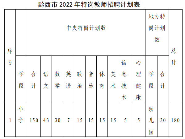 2022年黔西市“特岗计划”共招聘180名,其中中央“特岗计划”150名,用于招聘农村小学教师;参照中央“特岗计划”,实施地方“特岗计划”30名,用于招聘农村幼儿园教师。具体学科岗位招聘计划详见《黔西市2022年特岗教师招聘计划表》(附件1)。