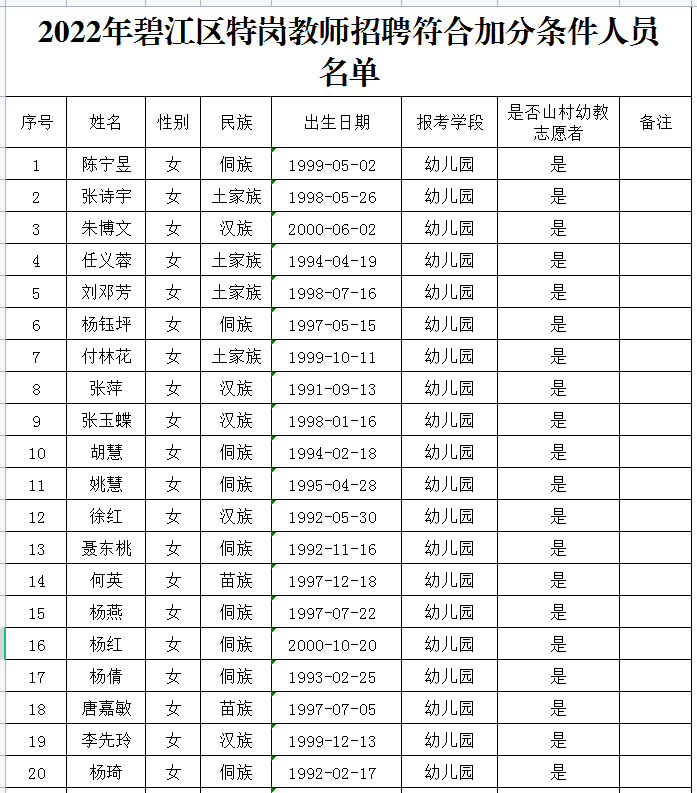 现将符合山村幼教志愿者加分条件人员名单公示如下,公示时间:2022年7月11日至2022年7月15日止。如考生对加分情况有异议,请在公示期内向碧江区教育局反映,电话:0856-5420838。