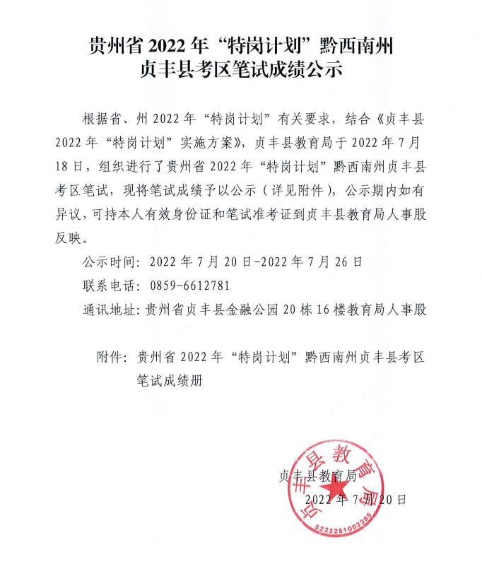 附件:贵州省2022年“特岗计划”黔西南州贞丰县考区笔试成绩册.pdf
