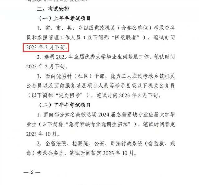 2.全省法院、检察院、公安、司法行政系统(含监狱、戒毒)考录公务员,笔试时间暂定2023年10月。