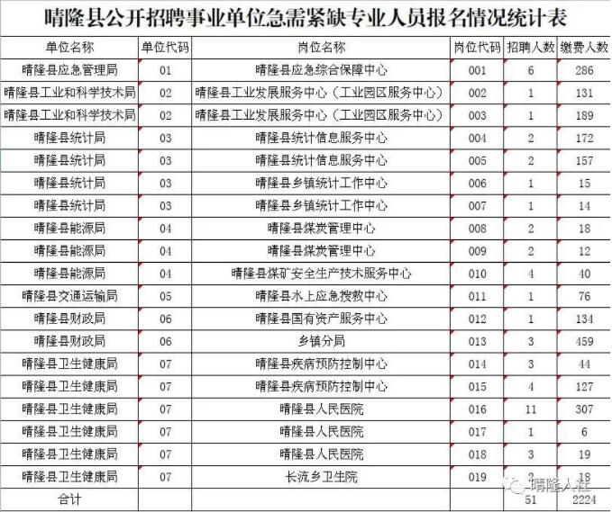 根据《贵州省事业单位工作人员公开招聘暂行办法》(黔人发〔2006〕4号)、《关于印发<贵州省事业单位公开招聘操作办法(试行)>的通知》(黔人社厅发〔2013〕10号)、州人民政府办公室《转发州人事局关于贯彻<贵州省事业单位新增人员公开招聘暂行办法>的实施意见的通知》(州府办发〔2006〕48号)规定,经县委、县人民政府研究决定,晴隆县拟面向社会公开招聘事业单位急需紧缺专业人员51名。经网上报名、资格初审、缴费等环节,共有2797人报名,资格审查合格2552人,最终报名缴费成功2224人,平均竞争比43.6:1。其中:竞争最激烈的岗位为晴隆县工业和科学技术局003岗位,竞争比例达189:1;报名人数最少的岗位为晴隆县卫生健康局017岗位(晴隆县人民医院),该岗位招聘1人,实际缴费6人,竞争比6:1。