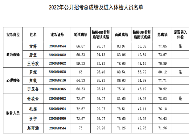 根据《贵州省实验中学2022年公开招聘工作人员方案》规定,现将贵州省实验中学2022年公开招聘工作人员总成绩及体检相关事宜予以公告。