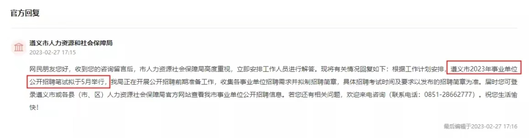 根据工作计划安排,道义市2023年事业单位公开招聘笔试拟于5月举行,我局正在开展公开招聘前期准备工作,收集各事业单位招聘需求并拟制招聘简章,具体招聘考试时间及要求以发布的招聘简章为准。届时您可登录道义市或各(市、区)人力资源社会保局官方网站查看我市事业单位公开招信息,若您还有相关问题,欢迎来电咨询联系电话:0851-2866277),祝您生活值快!