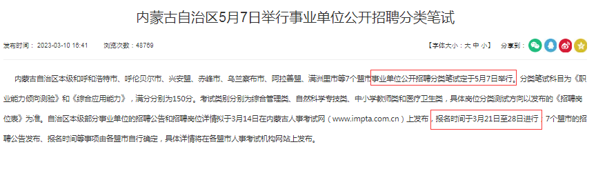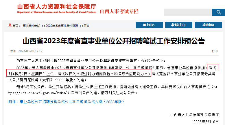2、2023年山西省直事业单位将参加全国联考,笔试定于5月7日举行,笔试科目为《职业能力倾向测验》和《综合应用能力》。公告预计3月底发布。详情如下: