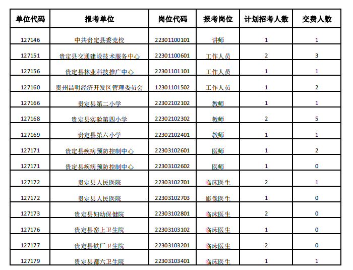 截至2023年4月11日17:00,贵定县2023年统一面向社会公开招聘事业单位工作人员缴费不足3:1岗位公示如下: