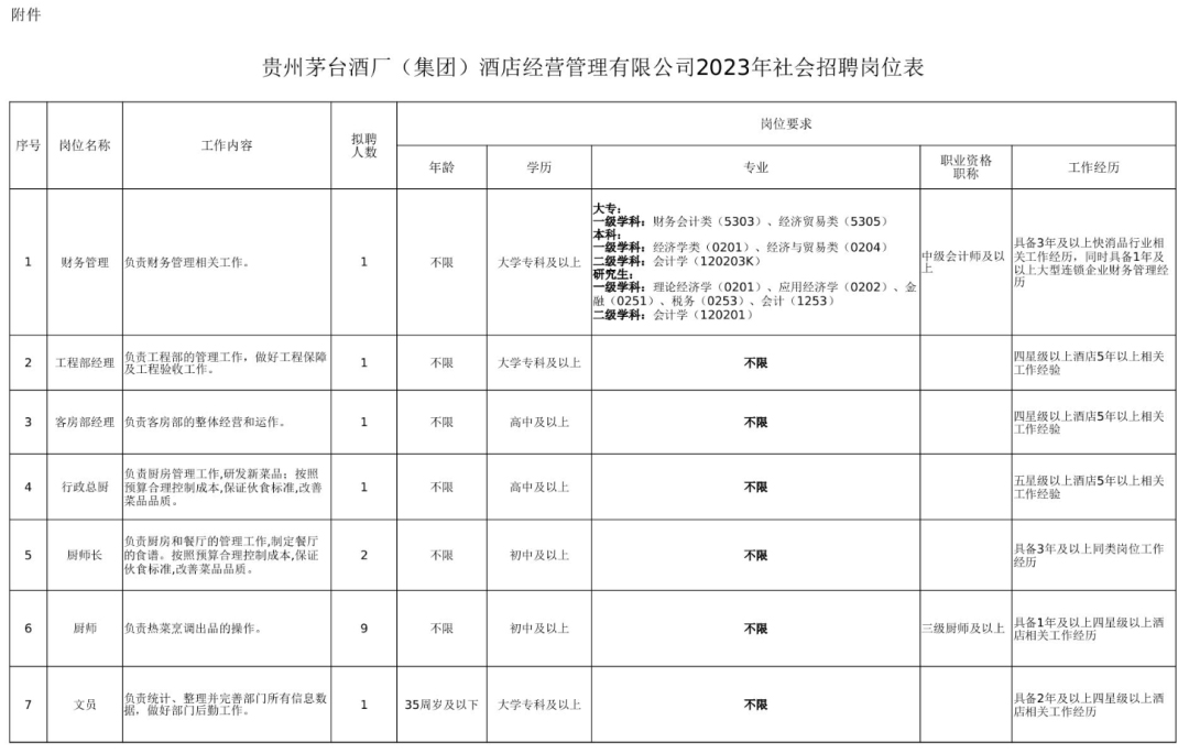具体招聘岗位及条件详见附件《贵州茅台酒厂(集团)酒店经营管理有限公司2023年社会招聘岗位表》。本次招聘岗位的工作地点在贵州省遵义市仁怀市茅台镇。