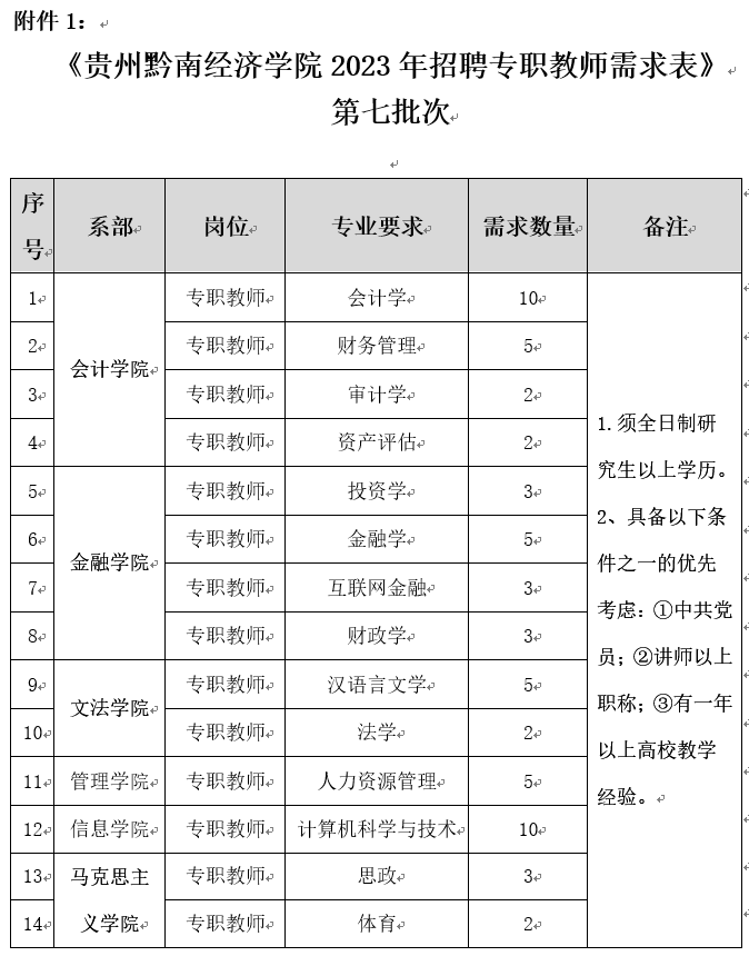 附件1:《贵州黔南经济学院2023年招聘专职教师需求表》第七批次