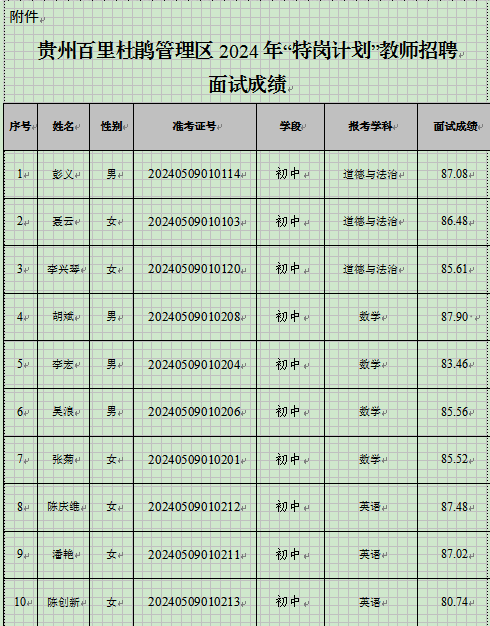 附件:贵州百里杜鹃管理区2024年“特岗计划”教师招聘面试成绩