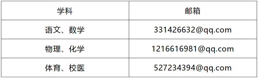 凡符合应聘条件者,请将简历材料及相关证书扫描件发送到指定邮箱(邮箱见下表)。注:以“学科+姓名”为文件名将个人简历及相关证书扫描成一个PDF发送到指定邮箱。