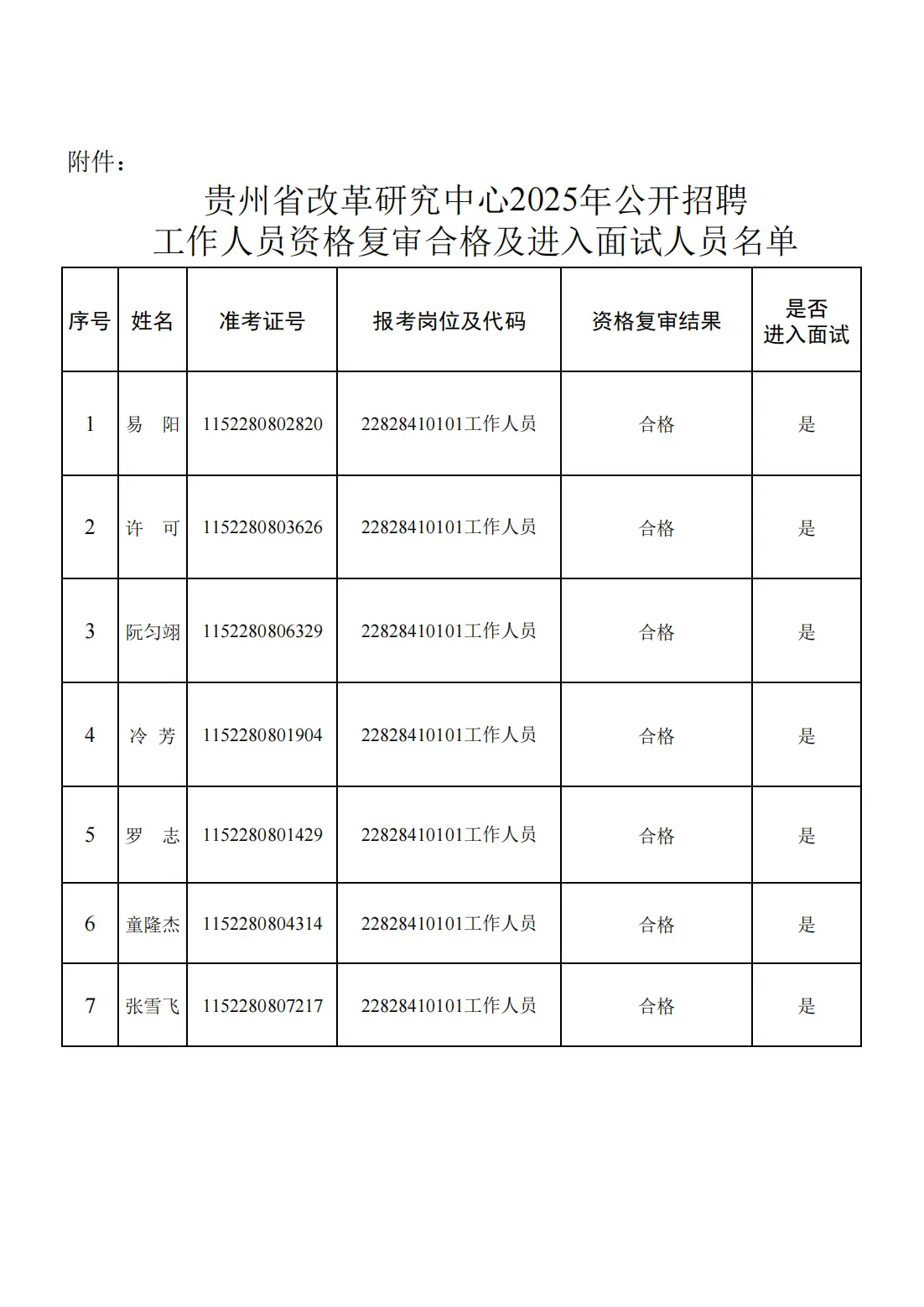 根据报考人员的笔试成绩由高到低、单个岗位招聘计划数与该岗位参加资格复审人员数1:3的比例确定进入资格复审人员,同一岗位应聘人员笔试成绩末位并列的同时进入资格复审,对因自愿放弃产生空缺的职位按照笔试成绩由高到低依次进行了递补,易阳等7人进入面试,资格复审合格及进入面试人员名单详见本公告附件《贵州省改革研究中心2025年公开招聘工作人员资格复审合格及进入面试人员名单》。