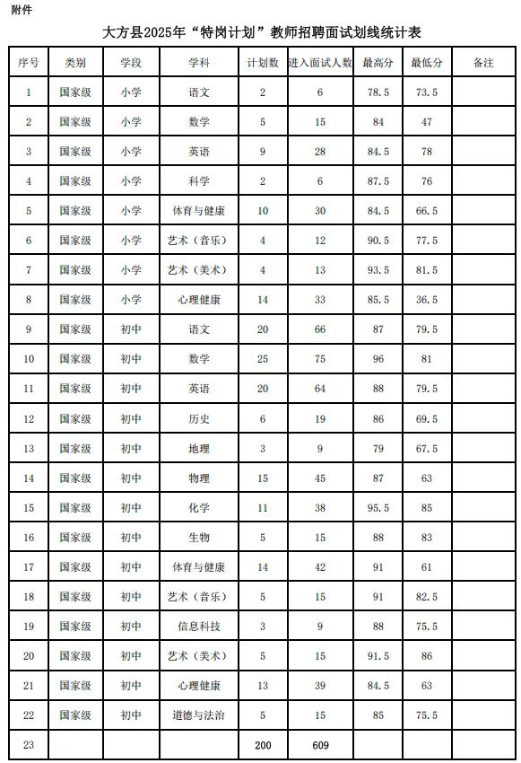 附件:大方县2025年“特岗计划”教师招聘面试划线统计表